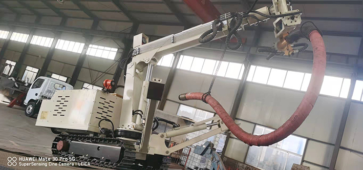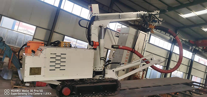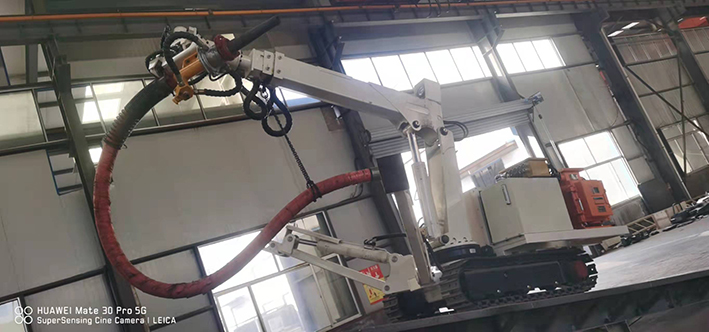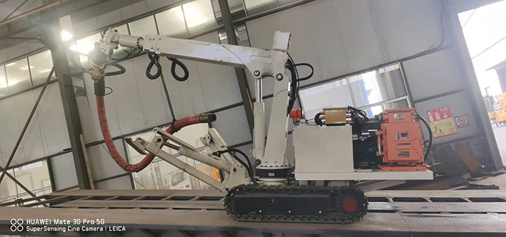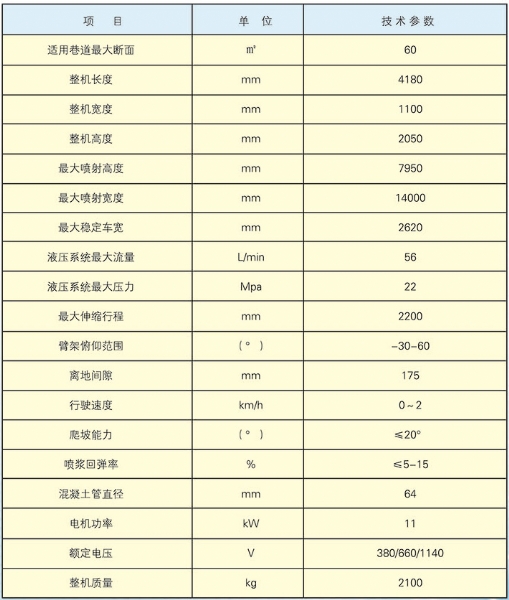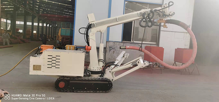 CPF-6OLY型礦用混凝土輔助噴射車(以下簡稱噴漿機械手)主要用于煤礦井下煤巷、半煤巷、全巖石掘進巷道與混凝土噴射機配套使用,代替人工噴漿作業(yè),滿足噴漿工藝要求,整機小巧、靈活、耐用、適應能力強,可用于大型噴漿機組無法進入的巷道,實現(xiàn)噴漿無線操作、機械化作業(yè),減輕人工噴射勞動強度大的問題。整機完全采用無線遙控操作、液壓控制,工作性能安全可靠。下車液壓系統(tǒng)負責行走、上車液壓系統(tǒng)負責噴射,上下車動作手動切換,防止誤操作。整機具有結構穩(wěn)定可靠,動作平穩(wěn),噴射范圍大,自由度多,遙控操作靈活,噴射平整度好,回彈少,噴射效率高、施工質量好,可實現(xiàn)遠程控制,操作人員可位于在可視情況好、粉塵濃度少,較為安全的位置操作,保證使用人員安全。